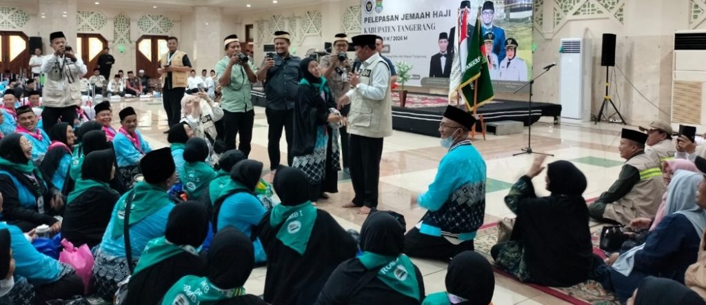 BBS.COM | TANGERANG – Maesyal Rasyid secara resmi melepas keberangkatan 393 jamaah haji asal Kabupaten Tangerang. Yang tergabung dalam kelompok terbang (kloter) ke-5 Provinsi Banten. Sabtu (25/4/2026). Prosesi pelepasan berlangsung di Masjid Al-Amjad.
