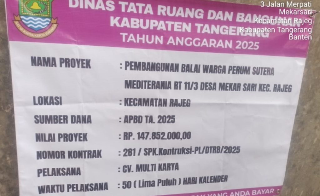 BBS.COM | TANGERANG— Proyek pembangunan Balai Warga Perum Sutera Mediterania RT/RW 011/03, Desa Mekarsari, Kecamatan Rajeg. Yang dibiayai dari APBD Kabupaten Tangerang Tahun 2025 menuai sorotan dari masyarakat. Dan lembaga swadaya masyarakat (LSM).