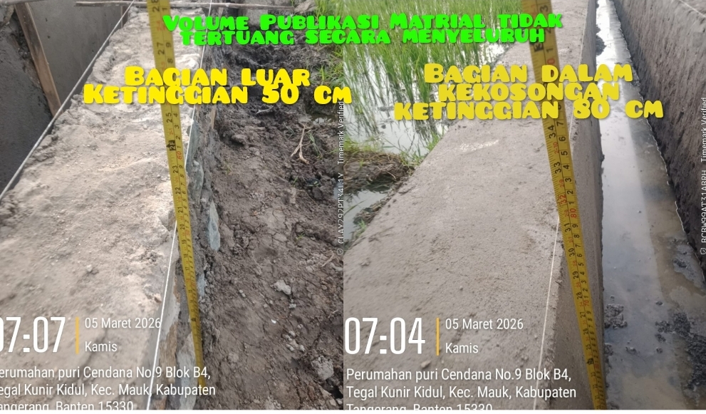 BBS.COM| TAANGERANG, Minggu (5 April 2026) – Proyek pembangunan Sistem Pengelolaan Air Limbah (SPAL). Yang berlokasi di Perumahan Puri Cendana RT/RW 014/04, Desa Tegal Kunir Kidul. Kecamatan Mauk, Kabupaten Tangerang, yang bersumber dari APBD 2026. Diduga tidak sesuai dengan spesifikasi teknis yang telah ditetapkan oleh pemerintah daerah.