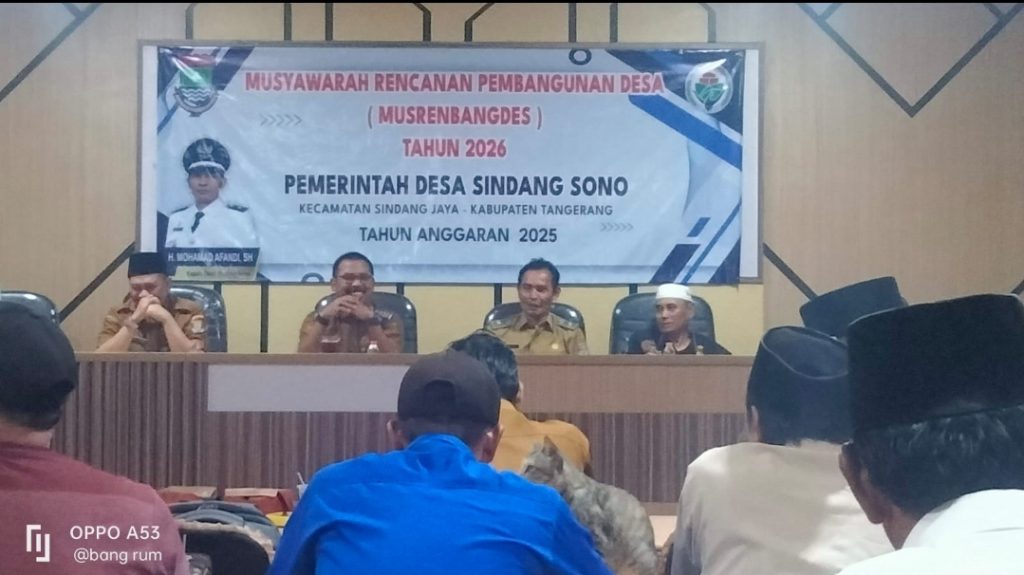 BBS.COM | TANGERANG – Pemerintah Desa Sindangsono, Kecamatan Sindang Jaya, Kabupaten Tangerang, menggelar Musyawarah Perencanaan Pembangunan Desa (Musrenbangdes) dalam rangka penyusunan Daftar Usulan Rencana Kerja Pemerintah Desa (DU-RKP) Tahun 2026. Kegiatan ini dilaksanakan di Aula Kantor Desa Sindangsono pada hari Selasa (07/10/2025).