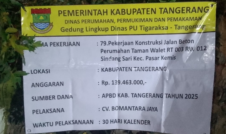 BBS.COM | TANGERANG Proyek pembangunan jalan beton di Perumahan Taman Walet, RT/RW 03/012, Kelurahan Sindang Sari, Kecamatan Pasarkemis, Kabupaten Tangerang. Banten, menuai sorotan warga dan aktivis. Proyek yang bersumber dari APBD 2025 dengan nilai Rp139.463.000,00 melalui Dinas Perumahan, Permukiman. Dan Permakaman (Perkim) ini diduga tidak sesuai dengan spesifikasi teknis. Sebagaimana tercantum dalam Rencana Anggaran Biaya (RAB). Selasa (21/10/2025) malam