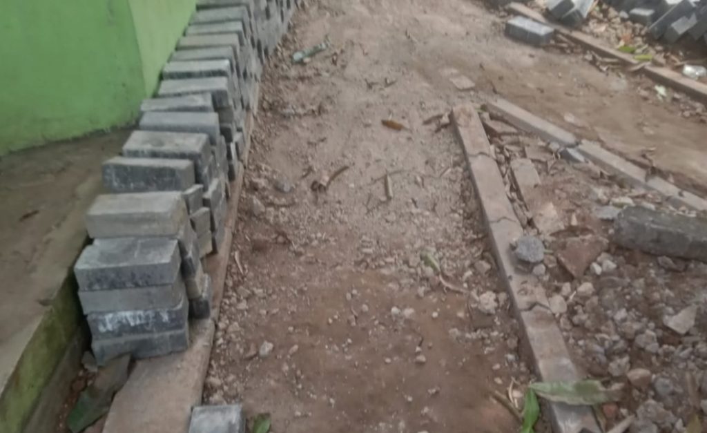Kesan pekerjaan yang dikerjakan tanpa perencanaan dan pengawasan teknis. Semakin kuat karena pola pemasangan paving terlihat tidak mengikuti garis lurus yang rapi. Seperti standar pengerjaan paving pada umumnya.