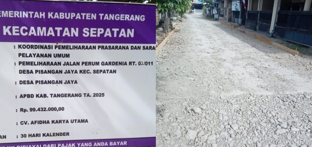 BBS.COM | TANGERANG — Proyek Pemeliharaan Jalan Perum Gardenia yang berlokasi di RT/RW 02/011, Desa Pisangan Jaya, dan bersumber dari APBD 2025. Diduga tidak dilaksanakan sesuai spesifikasi teknis. Pekerjaan yang berada di bawah kewenangan Kecamatan Sepatan dengan pelaksana CV. Afidha Karya Utama ini memiliki nilai kontrak sebesar Rp 99.432.000 dengan durasi pengerjaan 30 hari kalender.