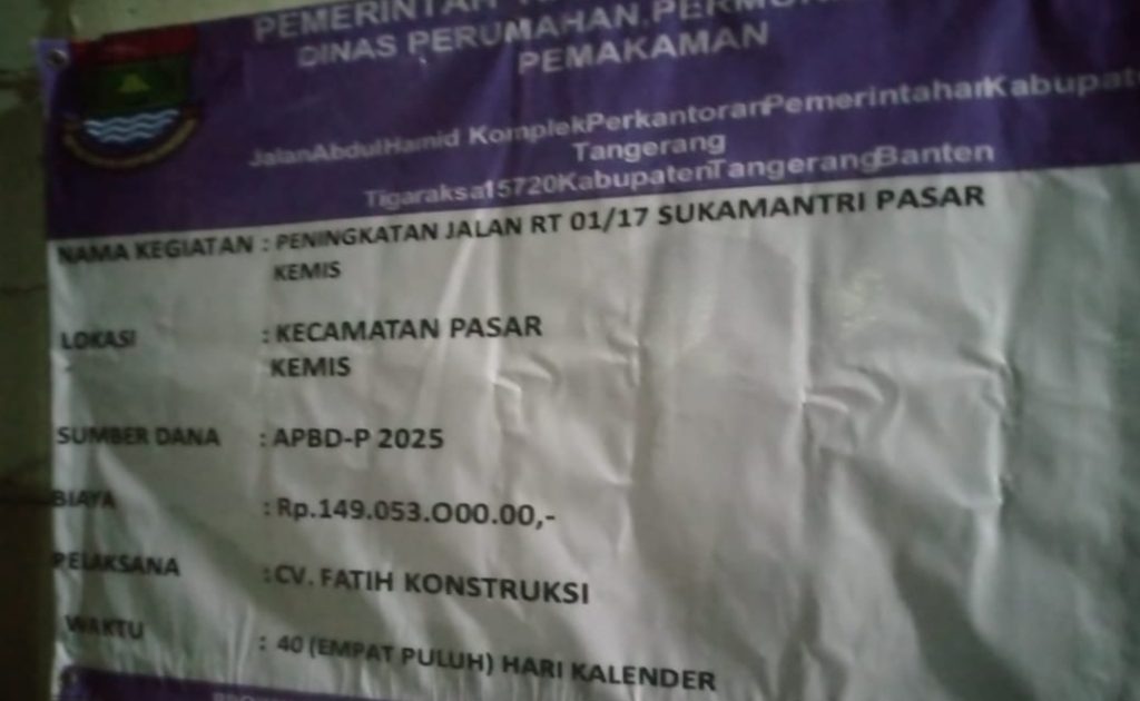 BBS.COM | TANGERANG— Proyek peningkatan jalan di Perumahan Persada RT/RW 001/017, Desa Sukamantri, Kecamatan Pasar Kemis, Kabupaten Tangerang, menuai sorotan warga. Pekerjaan yang dibiayai melalui APBD-P Tahun 2025 oleh Dinas Perumahan, Permukiman. Dan Pemakaman (Perkim) Kabupaten Tangerang. Dengan nilai sekitar Rp149 juta itu. diduga tidak sesuai dengan spesifikasi teknis maupun acuan kontrak. Yang ditetapkan pemerintah daerah.