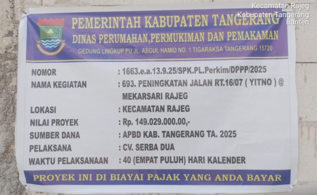 BBS.COM | TANGERANG– Proyek peningkatan jalan paving block di RT 016/RW 007, Desa Mekar Sari, Kecamatan Rajeg, Kabupaten Tangerang, yang dibiayai melalui APBD Tahun 2025 milik Dinas Perumahan dan Permukiman (Perkim) serta dilaksanakan oleh CV. Serbadua, menuai sorotan dari masyarakat dan aktivis setempat.