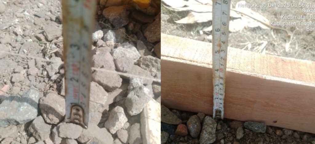 Selain itu, pemasangan bekisting diduga dilakukan di bawah agregat, sehingga ketebalan beton tidak sesuai spesifikasi volume yang ditetapkan pemerintah. Kondisi ini dikhawatirkan dapat merugikan keuangan negara.