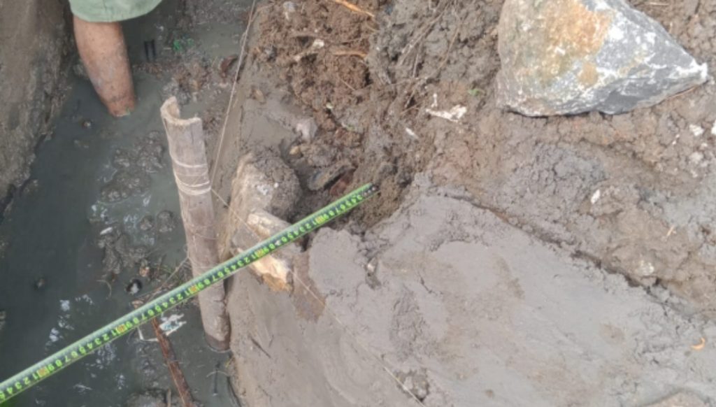 Sebelum pelaksanaan, lokasi proyek diketahui sudah memiliki saluran air lama. Namun, pihak pelaksana hanya melakukan penggalian ulang pada jalur eksisting dengan volume galian yang tidak maksimal. Lebar galian menyempit tetapi tetap dipaksakan untuk pemasangan batu belah. Sehingga struktur saluran menjadi tidak optimal dan berpotensi mudah rusak.
