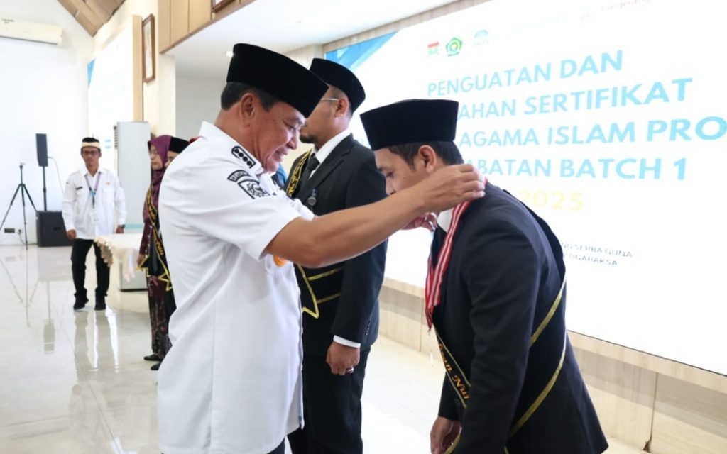 “Alhamdulillah, satu per satu harapan itu terkabul. Dari 753 peserta, sebagian besar telah lulus. Sisanya, sekitar 400 orang, mari kita doakan agar segera mendapatkan pengakuan yang sama,” ujar Bupati Maesyal Rasyid saat menghadiri kegiatan Penguatan dan Penyerahan Sertifikat Guru PAI Profesional Dalam Jabatan Batch 1 Tahun 2025 di Gedung Serba Guna (GSG) Puspemkab Tangerang, Rabu (3/12/25).