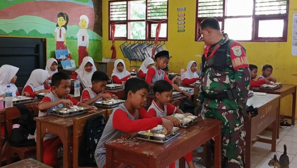 Danramil menyaksikan langsung proses pendistribusian makanan, memastikan setiap porsi bergizi tersampaikan dengan baik ke tangan para siswa.